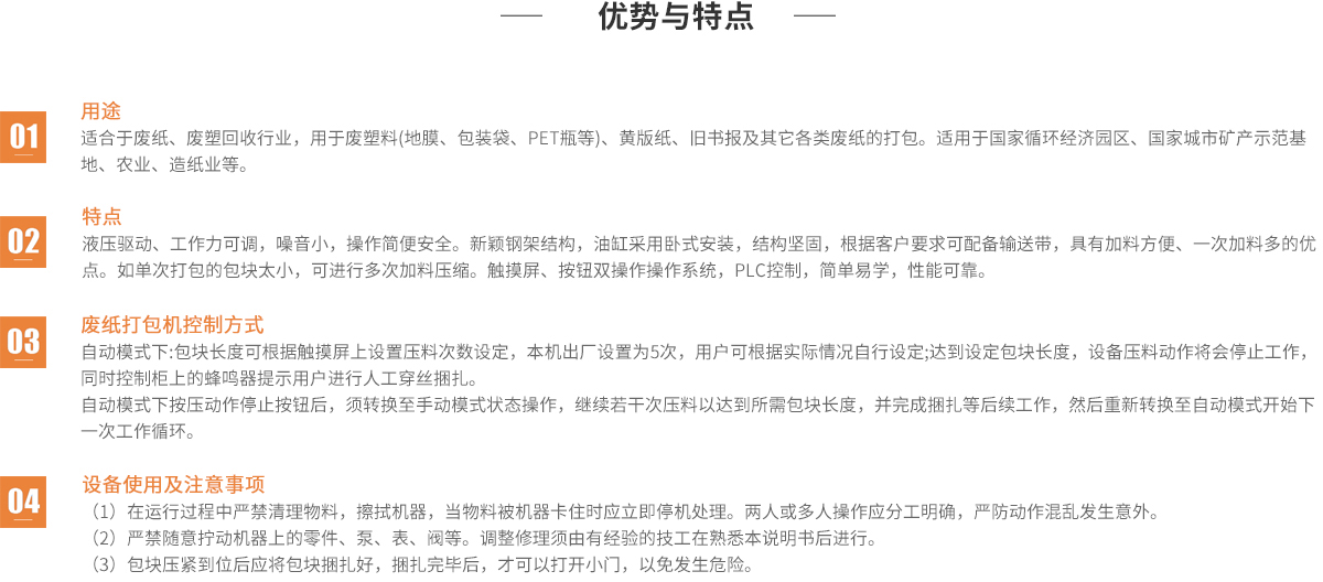 用途:適合于廢紙、廢塑回收行業,用于廢塑料(地膜、包裝袋、 PET瓶等)、黃版紙、舊書報及其它各類廢紙的打包。適用于國 家循環經濟園區、國家城市礦產示范基地、農業、造紙業等。