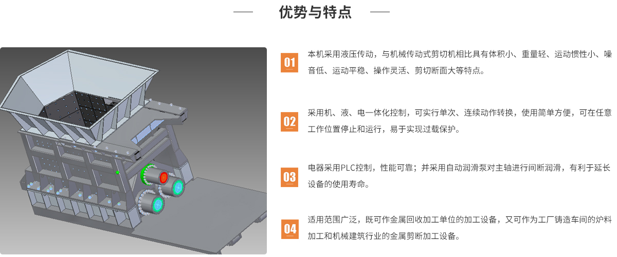 適合于各種斷面形狀的輕薄料(如彩鋼瓦、槽鋼、鋼板等)的冷態剪切,使之成為符合要求的爐料;并便于儲存和運輸,可以為金屬回收業、鑄造冶煉業、機械建筑業等眾多行業配套服務。