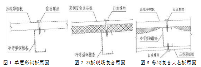 依據(jù)面板層的選用不同,彩鋼屋面可大致分為單層彩鋼板屋面、雙板現(xiàn)場復(fù)合屋面和彩鋼復(fù)合板屋面(見圖1、圖2、圖3)。