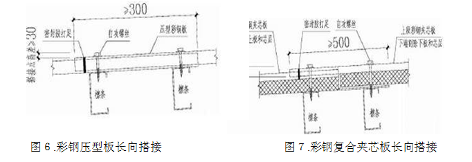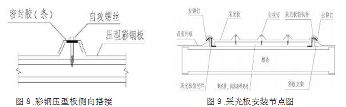 ⑦連接細部構(gòu)造防水:連接件主要有自攻螺絲和拉鉚釘,連接打釘必須在屋面板的波峰上,嚴禁在波谷和波峰中部設(shè)計打釘。為防止自攻釘墊圈老化,最好在釘帽下增設(shè)EPDM墊圈,在連接采光板時,自攻釘下應(yīng)增設(shè)馬鞍形復(fù)合橡膠墊,在所有拉鉚釘連接處均應(yīng)設(shè)計打膠密封。