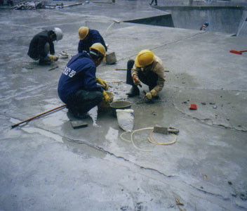 堵漏:用鑿子或沖擊鉆將滲水部位打成4~5cm深,直徑2~3cm的孔洞,用于沖洗干凈后,r-1型材料加水(灰:水=1:0.3)攪拌均勻,捏成料團(tuán)(料團(tuán)大小與孔洞相近),手掌感覺(jué)發(fā)熱,迅速將料團(tuán)塞于孔中,并用手掌壓住幾分鐘,手掌感到發(fā)硬后,松開(kāi)手掌,再用木板壓平。15min后進(jìn)行濕養(yǎng)護(hù);